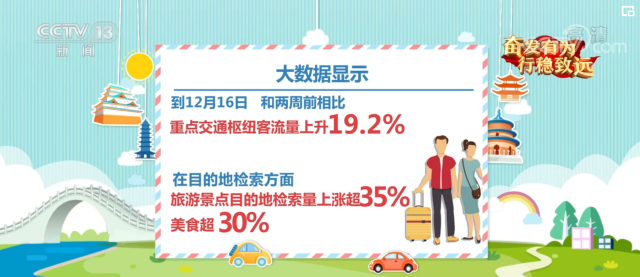 防控措施的優(yōu)化讓不少城市的人間“煙火氣”悄然回歸。大數據顯示,到12月16日,和兩周前相比,重點交通樞紐客流量上升19.2%。在目的地檢索方面,旅游景點目的地檢索量上漲超35%、美食超30%。