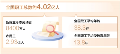 本報北京3月26日電 (記者易舒冉)記者日前從中華全國總工會獲悉:第九次全國職工隊伍狀況調(diào)查已于近期結(jié)束,調(diào)查表明,目前全國職工總數(shù)4.02億人左右,新就業(yè)形態(tài)勞動者8400萬人,農(nóng)民工2.93億人;職工平均年齡38.3歲、平均受教育年限13.8年。調(diào)查還顯示,職工理想信念更加堅定,主人翁地位持續(xù)鞏固,越來越多的職工積極投身“當好主人翁、建功新時代”“建功‘十四五’、奮進新征程”等主題勞動和技能競賽。