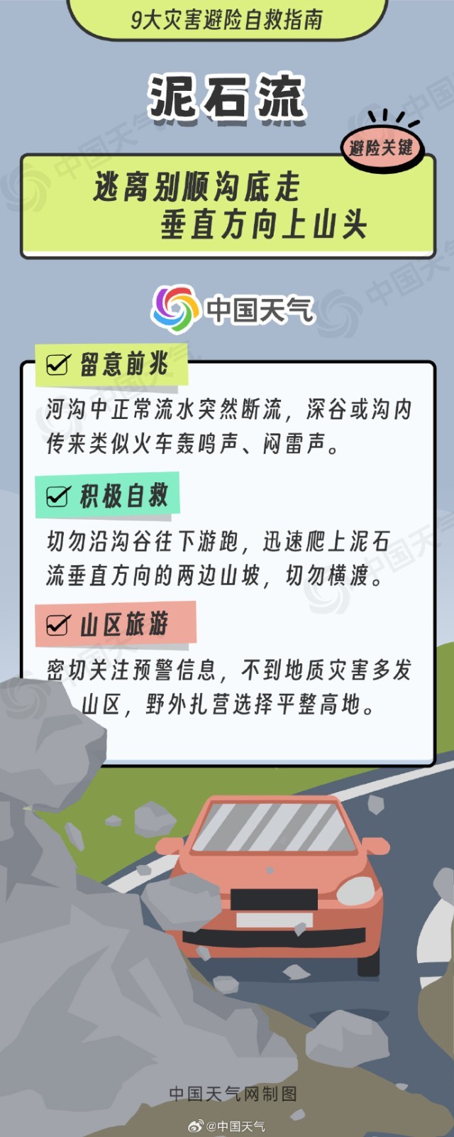 雨后山區(qū)道路沿線易發(fā)生落石,大家請避免在陡峭石壁或凸石下停留,當災害發(fā)生時要迅速向崩塌體兩側(cè)逃生;房前屋后土體突然鼓脹,局部出現(xiàn)滑塌或裂縫,并有水流滲出時,要警惕滑坡災害,快速向滑動方向兩側(cè)逃離;地面出現(xiàn)環(huán)狀裂縫,地形下凹或地表水快速滲漏,建筑物出現(xiàn)傾斜開裂時,要迅速遠離沉陷地帶。