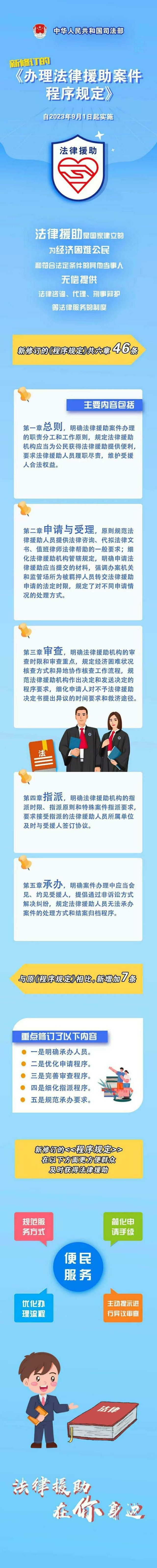 為貫徹落實(shí)法律援助法,提高法律援助案件辦理程序的標(biāo)準(zhǔn)化規(guī)范化水平,司法部對2012年公布并施行的《辦理法律援助案件程序規(guī)定》進(jìn)行了全面修訂,修訂后的《程序規(guī)定》,在方便群眾及時(shí)獲得法律援助、提高法律援助服務(wù)質(zhì)量等方面,作出了一系列具體規(guī)定?!冻绦蛞?guī)定》自2023年9月1日起施行。