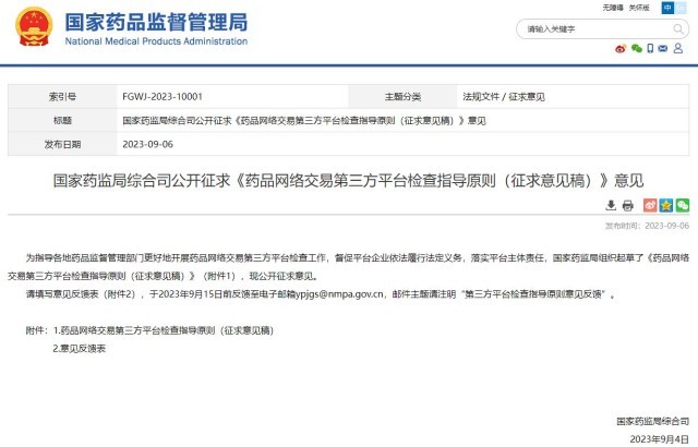 國家藥監(jiān)局就《藥品網(wǎng)絡交易第三方平臺檢查指導原則(征求意見稿)》公開征求意見