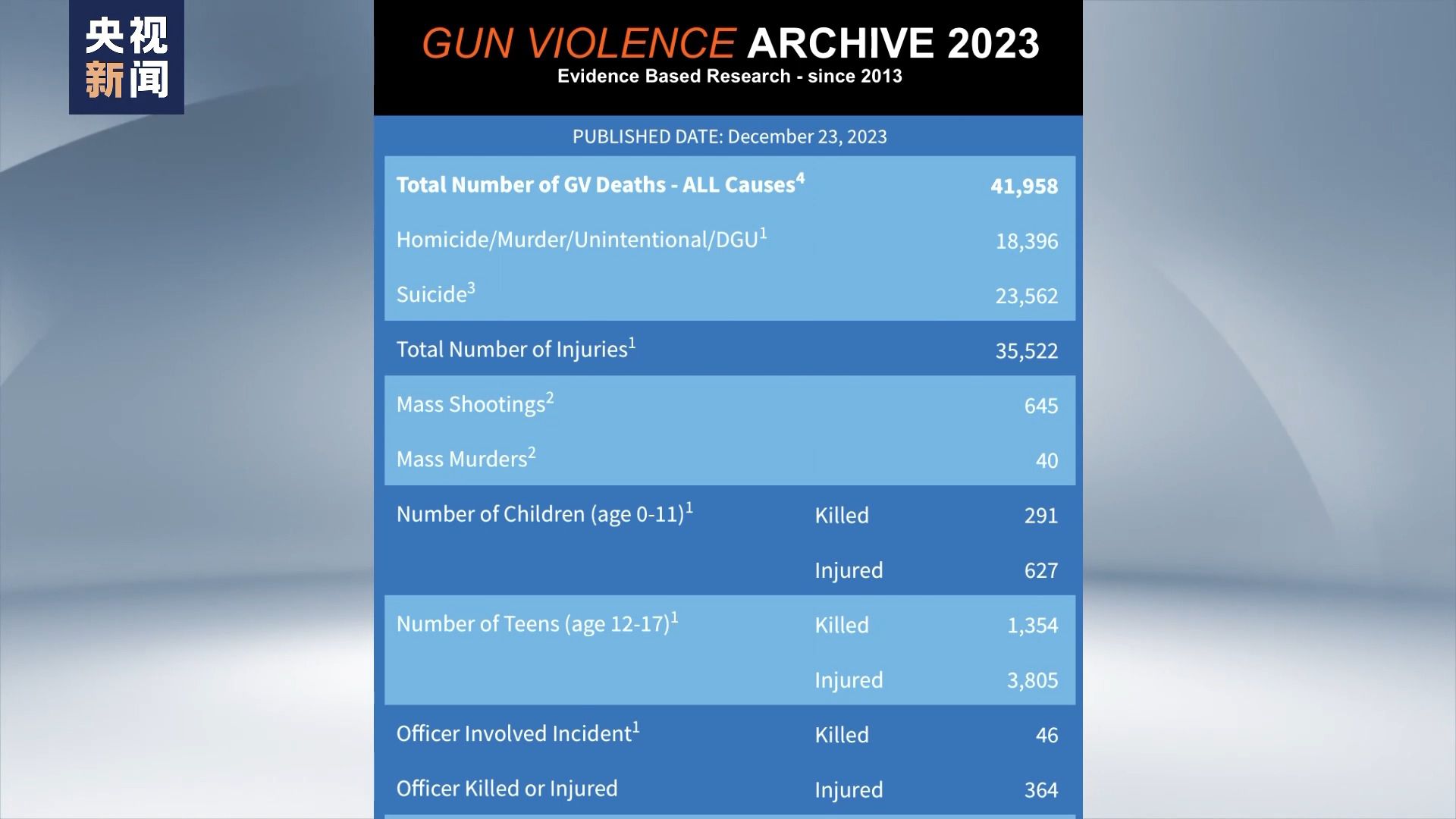 據美國“槍支暴力檔案”網站統計,截至12月23日,今年美國已發(fā)生645起造成除槍手外、至少4人死傷的大規(guī)模槍擊事件,近4.2萬人在各類涉槍事件中死亡。(央視新聞客戶端)