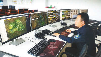 彭志杰在林場(chǎng)的森林防火指揮中心操作設(shè)備。本報(bào)記者 張騰揚(yáng)攝