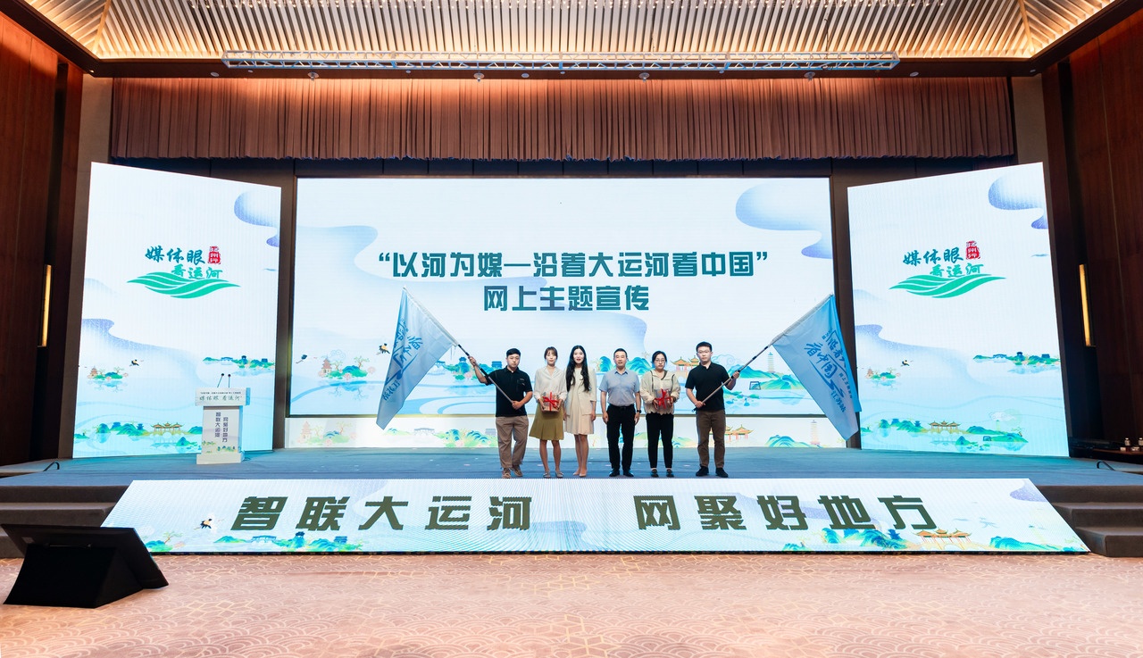 “以河為媒—沿著大運(yùn)河看中國”網(wǎng)上主題宣傳授旗、贈(zèng)書現(xiàn)場(chǎng)