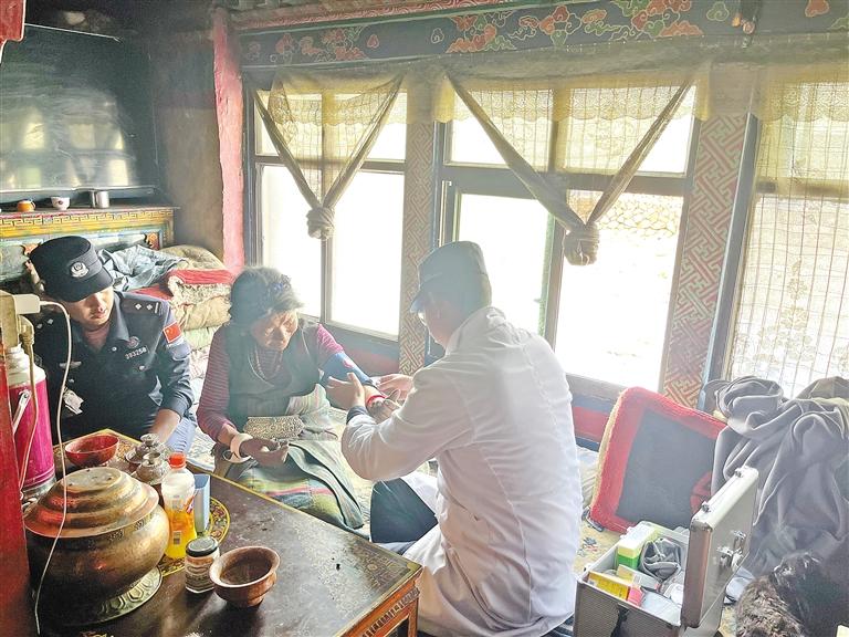 珠峰邊境派出所民警上門為駐地老人檢查身體。(配圖由通訊員 景浩 記者 楊子彥 攝)