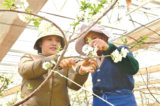 一條條有機基質(zhì)槽均勻分布,一座座日光溫室拔地而起。4月是車?yán)遄訕溟_花的時節(jié),走進位于烏米組的車?yán)遄臃N植大棚,就能看到車?yán)遄踊ǜ傁嗑`放,一簇簇白色的花朵開滿枝頭,在綠葉和枝干的映襯下,格外賞心悅目。置身于一片花海的當(dāng)?shù)貏?wù)工人員正搶抓農(nóng)時,為果樹疏剪花枝、人工授粉,大家各司其職、分工合作,一派熱火朝天的勞動場景。
