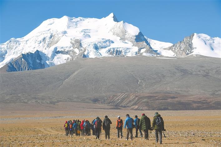 圖為希夏邦馬雪山下,戶外運(yùn)動(dòng)的人們在向?qū)ьI(lǐng)下徒步。記者 李洲 攝