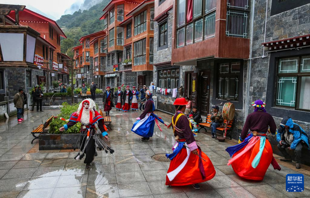 一排排整齊劃一的房屋前,門巴族同胞們正在表演“山南門巴戲”,他們載歌載舞、歡聲笑語。門巴文化獨具特色,山南門巴戲距今已有200余年歷史,劇情豐富、有聲有色,被列入國家級非物質文化遺產名錄。
