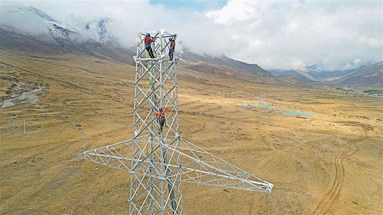 圖為工作人員在拉薩市林周縣色康村開展拉薩500千伏輸變電工程組塔作業(yè)。記者 格桑倫珠 攝