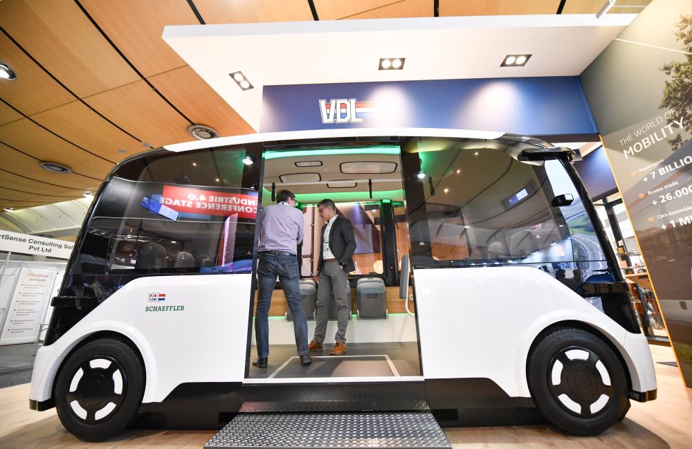 2024年4月23日,人們?cè)诘聡?guó)漢諾威工博會(huì)上參觀一款無(wú)人駕駛汽車(chē)。新華社記者任鵬飛攝