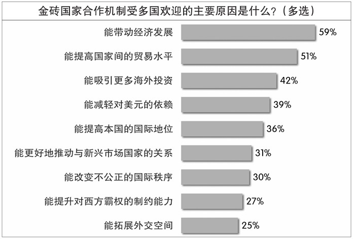 在12國受訪者看來,金磚機(jī)制受多國歡迎的最主要原因是它“能帶動經(jīng)濟(jì)發(fā)展”,有近六成受訪者認(rèn)同此原因。過半受訪者認(rèn)為,“能提高國家間的貿(mào)易水平”是金磚機(jī)制受歡迎的原因。此外,能“吸引更多海外投資”“減輕對美元的依賴”“提高本國國際地位”等原因也獲得較多認(rèn)同。王友明對《環(huán)球時報》記者分析說:“開放、包容、合作、共贏的精神是金磚國家能夠走向‘大金磚’的根本原因,這四個要素缺一不可?!?/p>
