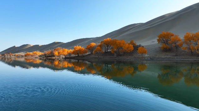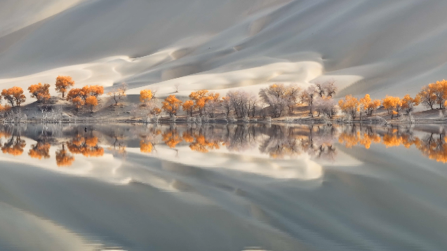 近日,新疆尉犁縣羅布湖風(fēng)景游覽區(qū)。羅布湖宛如一面明鏡,映照出周?chē)吧牡褂埃d延的沙丘、金色的胡楊、碧藍(lán)的天空,與湖面的鏡像世界構(gòu)成一幅絕美的自然畫(huà)卷。