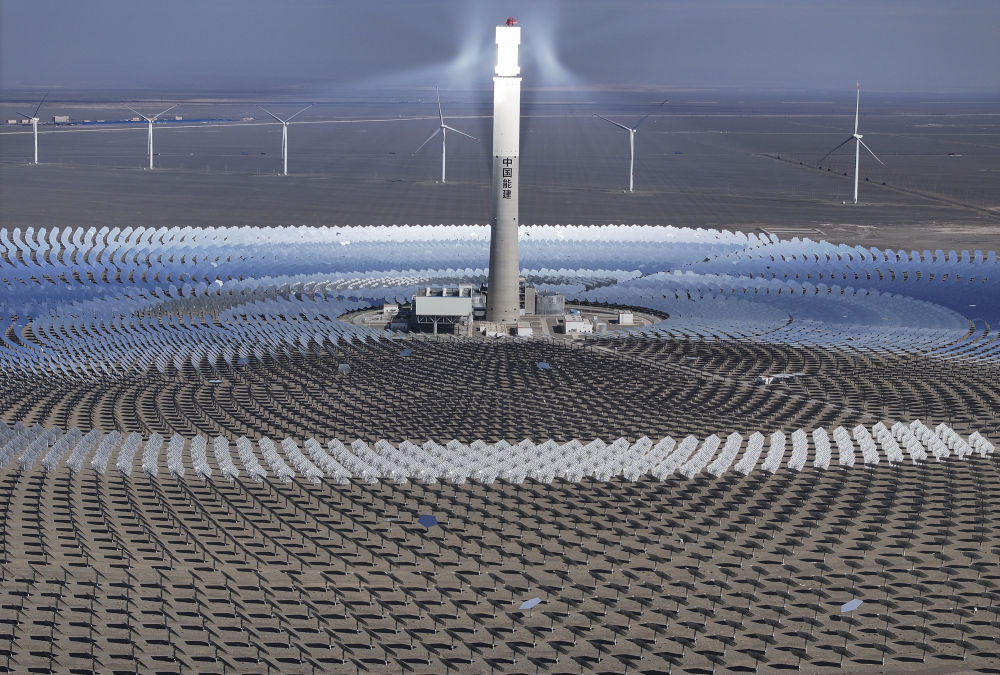 這是2024年9月12日在新疆哈密市伊吾縣淖毛湖鎮(zhèn)拍攝的國家光熱示范項目——熔鹽塔式50兆瓦光熱發(fā)電站(無人機(jī)照片)。新華社記者 胡虎虎 攝