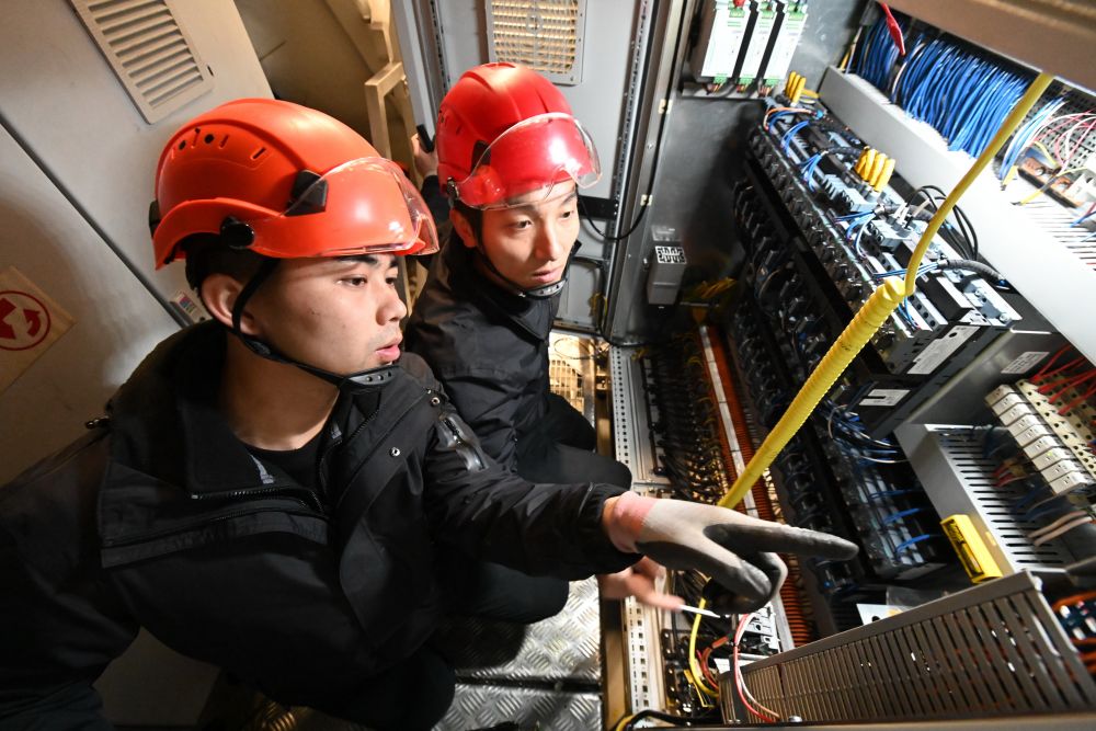 黃志明(右)和鄭桂雄在風(fēng)機(jī)機(jī)艙內(nèi)開展故障處理。新華社記者 林善傳 攝