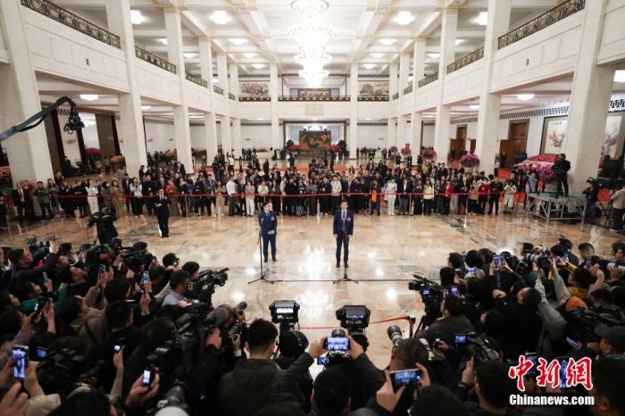 3月5日,十四屆全國人大三次會議首場“代表通道”集中采訪活動在北京人民大會堂舉行。全國人大代表、小米集團創(chuàng)始人、董事長兼首席執(zhí)行官雷軍(右)、全國人大代表、海爾集團董事局主席、首席執(zhí)行官周云杰接受采訪。中新社記者 富田 攝