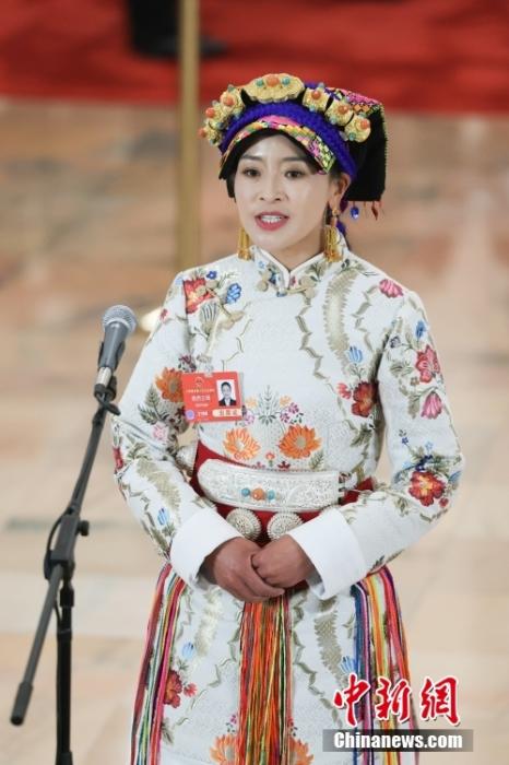 全國人大代表、四川省馬爾康市養(yǎng)護院院長格西王姆接受采訪。中新社記者 富田 攝