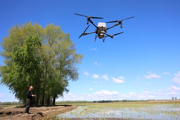 2025年5月21日,在北大荒集團(tuán)黑龍江綏濱農(nóng)場有限公司東井管理區(qū),操作員操控搭載北斗導(dǎo)航系統(tǒng)的植保無人機,對即將施返青肥的地塊進(jìn)行打點。新華社發(fā)(李興攝)