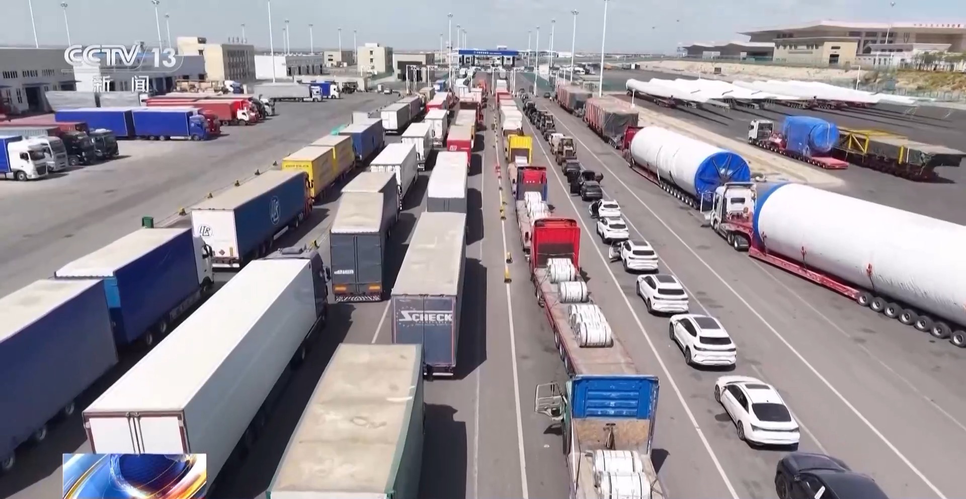 總臺央視記者 李廈:這里是霍爾果斯公路口岸,看我身邊龐大的車流,不僅有滿載跨境包裹的大貨車、更是有一眼望不到頭的國產(chǎn)新能源車和農(nóng)用機械車輛,甚至還有長達數(shù)十米的風機葉片,這些琳瑯滿目的中國好貨,正在24小時不停歇地從這條黃金大通道駛出國門。