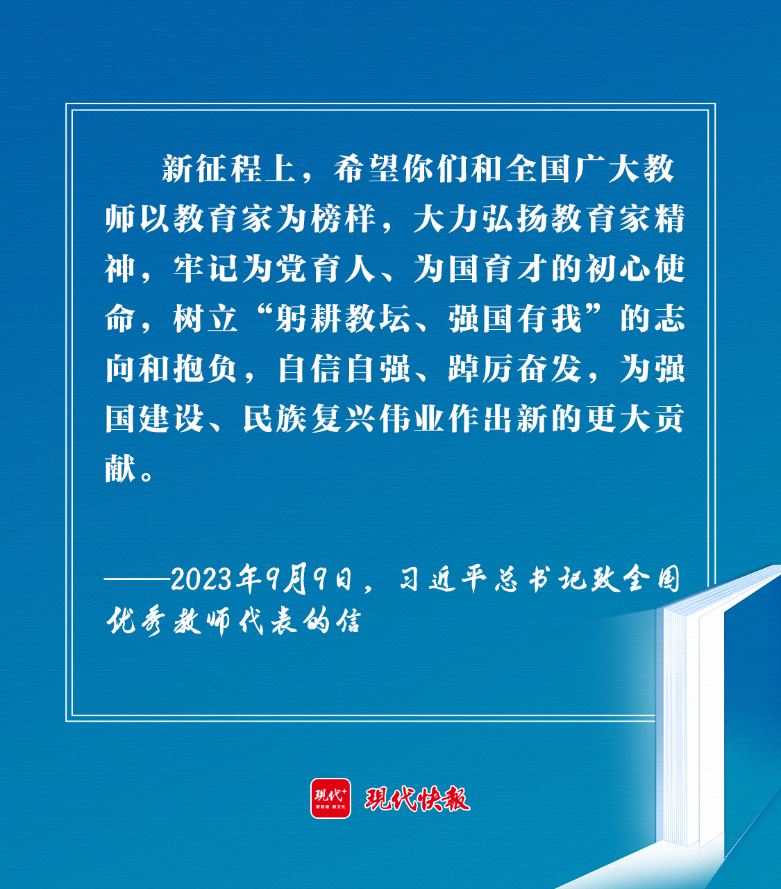 2023年9月9日,習(xí)近平總書記在致全國優(yōu)秀教師代表的信中強調(diào):“新征程上,希望你們和全國廣大教師以教育家為榜樣,大力弘揚教育家精神,牢記為黨育人、為國育才的初心使命,樹立‘躬耕教壇、強國有我’的志向和抱負,自信自強、踔厲奮發(fā),為強國建設(shè)、民族復(fù)興偉業(yè)作出新的更大貢獻?!?/p>