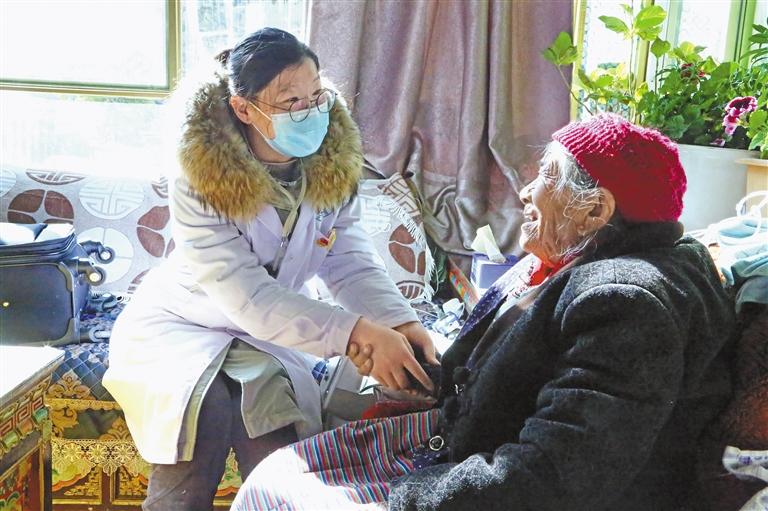 瓊結(jié)縣人民醫(yī)院主治醫(yī)師劉麗娟在了解社區(qū)老人的健康狀況。通訊員 倫珠澤仁 記者 次旺 攝