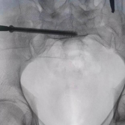 圖為透視下見(jiàn)置入的骶髂螺釘,位置、長(zhǎng)度精準(zhǔn),無(wú)絲毫偏差