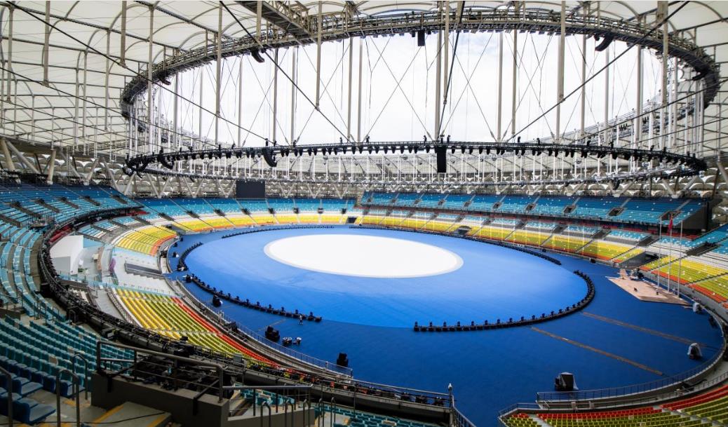 圖為第十二屆全國(guó)少數(shù)民族傳統(tǒng)體育運(yùn)動(dòng)會(huì)開幕式前繁忙的三亞市體育中心體育場(chǎng) 攝影:劉莉