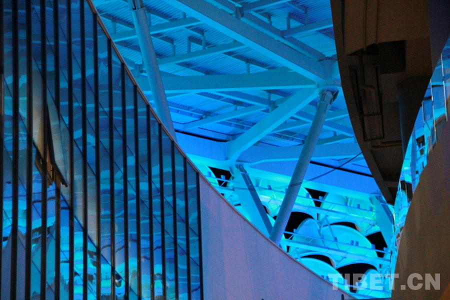 圖為三亞市體育中心體育場(chǎng)內(nèi)部的玻璃結(jié)構(gòu)反射的藍(lán)色燈光 攝影:劉莉