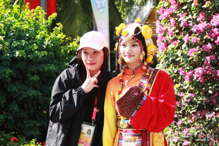 圖為第十二屆全國(guó)少數(shù)民族傳統(tǒng)體育運(yùn)動(dòng)會(huì)民族大聯(lián)歡活動(dòng)現(xiàn)場(chǎng),來(lái)賓與身著藏族服飾的演員合影 攝影:劉莉