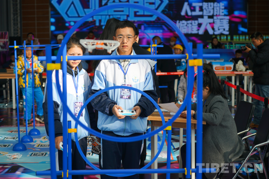 圖為西藏自然科學(xué)博物館首屆青少年人工智能編程大賽參賽選手正在進(jìn)行“無人機(jī)”編程項(xiàng)目的比賽 攝影:趙振宇