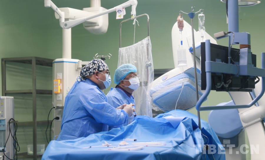 圖為陰赪茜(手術(shù)室內(nèi)右)趕赴阿壩州人民醫(yī)院手術(shù)救治急性心?;颊撸聊簧巷@示出陰赪茜正操作纖細的導絲嘗試通過患者發(fā)生閉塞的心臟血管 攝影:劉莉