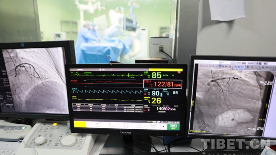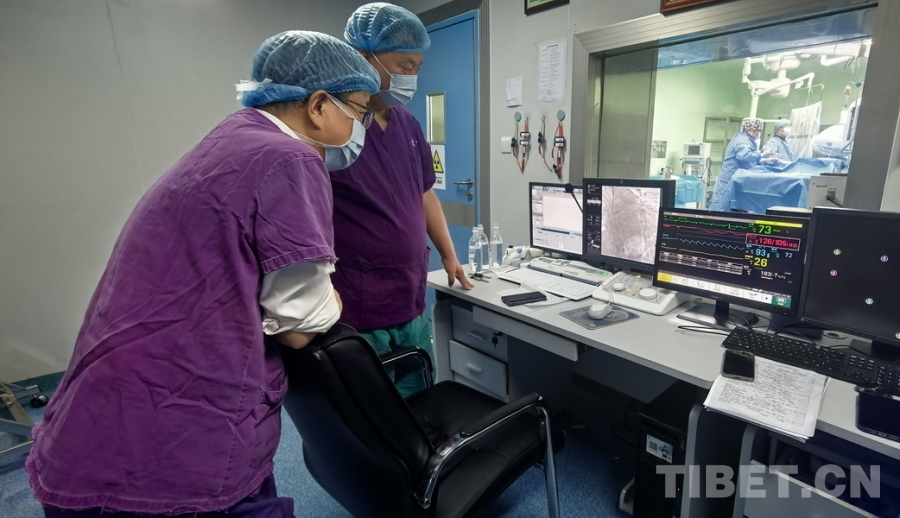 圖為陰赪茜(手術(shù)室內(nèi)右)趕赴阿壩州人民醫(yī)院手術(shù)救治急性心?;颊?,通過比對屏幕上的畫面,術(shù)后(左側(cè)屏幕)患者的心臟血管血流已較術(shù)前明顯恢復 攝影:劉莉