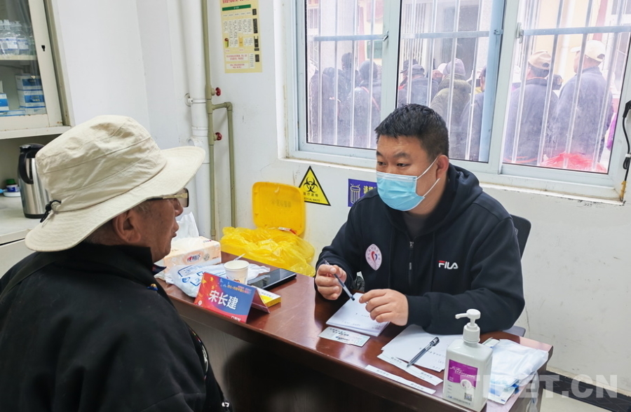 圖為火箭軍特色醫(yī)學(xué)中心口腔科醫(yī)師宋長建在義診中詢問就醫(yī)群眾病情 攝影:馬濤