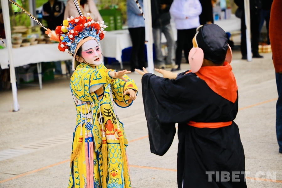 圖為小孩身著戲服嬉戲玩鬧 攝影:龍真多吉