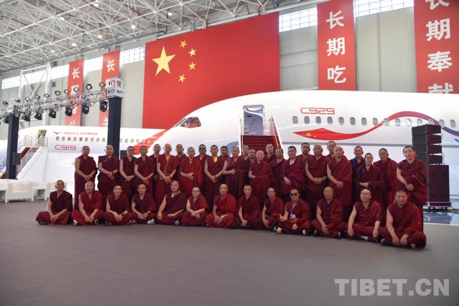 圖為西藏佛學(xué)院師生在中國(guó)商飛公司展廳合影,了解中國(guó)高端制造“新名片”的發(fā)展 攝影:趙振宇