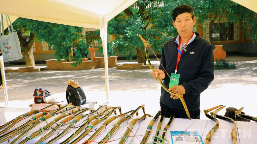 馬國(guó)財(cái)是一位來自青海省海東市樂都區(qū)的南山傳統(tǒng)牛角弓非遺傳承人,自曾祖父起他家在制作牛角弓方面的技藝是家喻戶曉的。他深受父輩的影響,做弓技藝更是嫻熟。此次活動(dòng),他帶來了自己的幾十張得意之作“南山傳統(tǒng)牛角弓”,在現(xiàn)場(chǎng)向?qū)ε=枪信d趣的游客耐心地講解選材、打磨、粘合、鋪筋、扎把、陰干、調(diào)試、加牛角、打磨、貼樺皮、上色等弓箭的制作過程,以及在生活當(dāng)中的實(shí)際應(yīng)用,讓更多的人了解到它不僅僅是一張普通的弓,更是祖祖輩輩的智慧結(jié)晶和珍貴非遺。