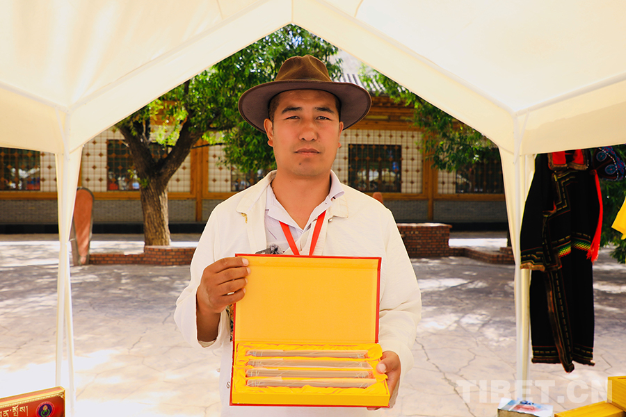 “我今天主要帶來的是我們的工藝產(chǎn)品‘供養(yǎng)藏香’,這些包裝樣式不一的藏香根據(jù)規(guī)格大小都有各自的價(jià)位,但每一根藏香上付出的心血及所使用的工藝和配料都一致,其中我們也更注重藏香的配料,都是精心篩選的白檀香、藏紅花、安息香、白黑沉香、甘松等二十多種源自高原的天然藥物和香味植物。”當(dāng)問到目前的銷售情況時(shí),他坦言道:“今天賣出去的并不是很多,不過今天能和眾多的優(yōu)秀手工藝人同臺(tái)參展機(jī)會(huì)難得,對(duì)我來說也是一種學(xué)習(xí)和展現(xiàn)的契機(jī)?!?/p>