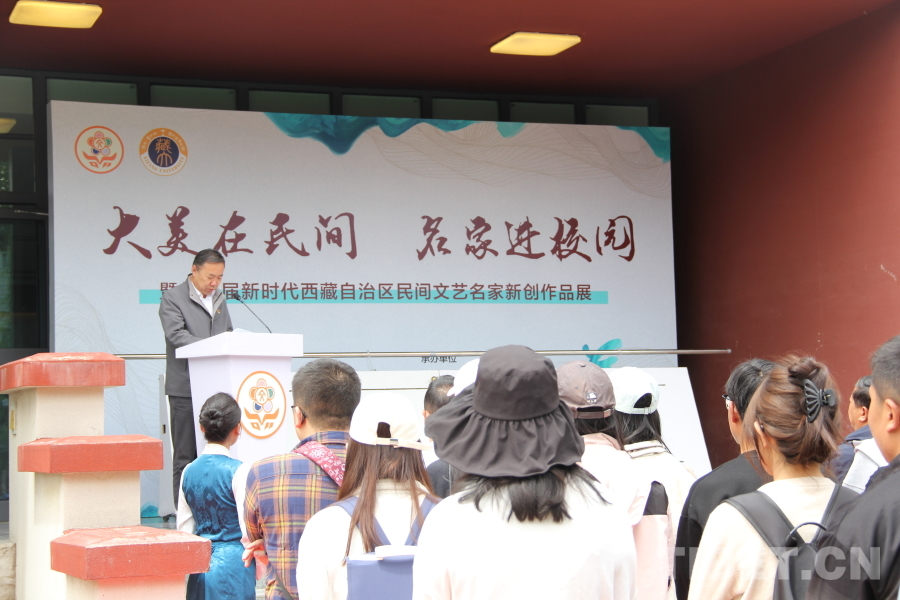 6月20日,“大美在民間——名家進校園暨第三屆新時代西藏自治區(qū)民間文藝名家新創(chuàng)作品展”開展。圖為西藏大學黨委常委、副校長王斌禮致辭 攝影:趙釗