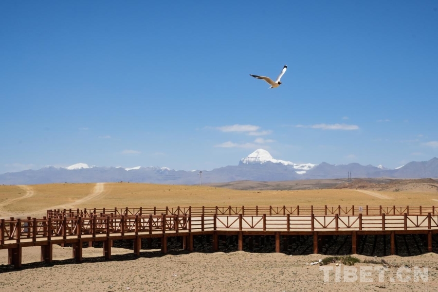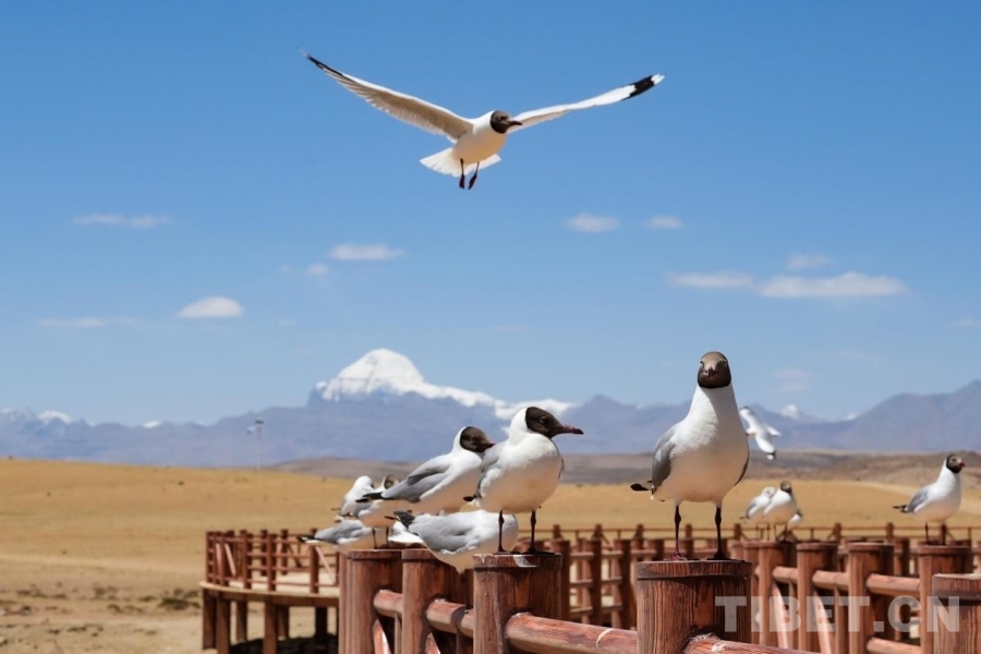 圖為立于瑪旁雍錯旁棧道上的棕頭鷗群,遠處是岡仁波齊峰 攝影:邊子捷