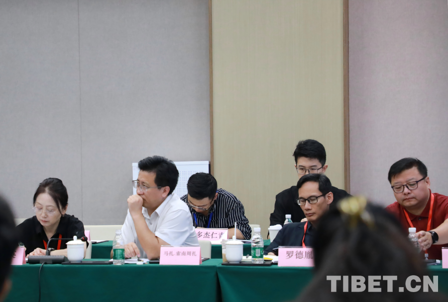 圖為馬扎·索南周扎(左二)在2025年8月北京相關(guān)座談會(huì)上聽(tīng)取專家學(xué)者的交流分享 攝影:楊月云