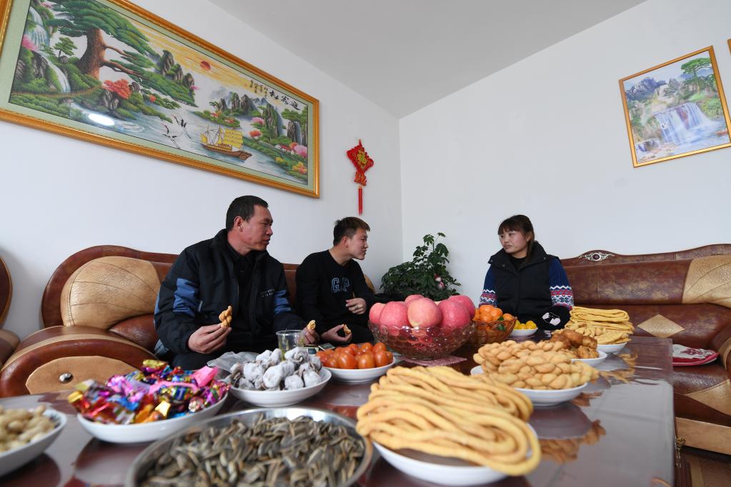 1月25日,在蘭州新區(qū)舟曲避險(xiǎn)搬遷安置點(diǎn),劉長海(左)、寧蘭玉(右)和孩子一起在家中吃飯。新華社記者 范培珅 攝
