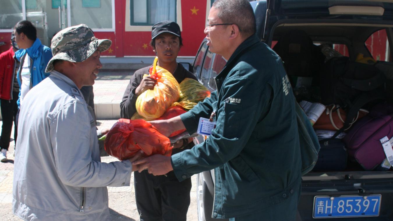 葛軍為“鴻雁天路”沿線牧民捎帶物資。中國郵政格爾木分公司供圖