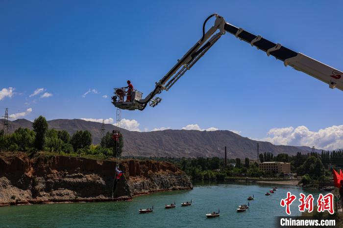 圖為演練現(xiàn)場(chǎng),登高平臺(tái)消防車(chē)負(fù)角度峽谷救援。黃開(kāi)森 攝