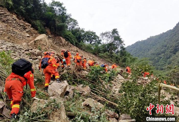 救援力量通過山體垮塌路段。四川森林消防供圖