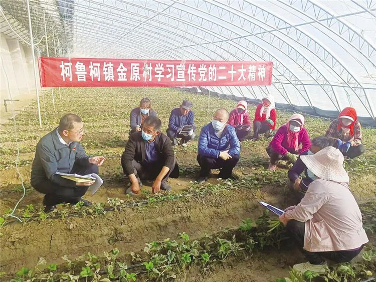 圖為青海省海西蒙古族藏族自治州德令哈市柯魯柯鎮(zhèn)金原村干部群眾在溫室大棚中進(jìn)行黨的二十大精神交流學(xué)習(xí) 圖片來(lái)源:德令哈發(fā)布微信公眾號(hào)