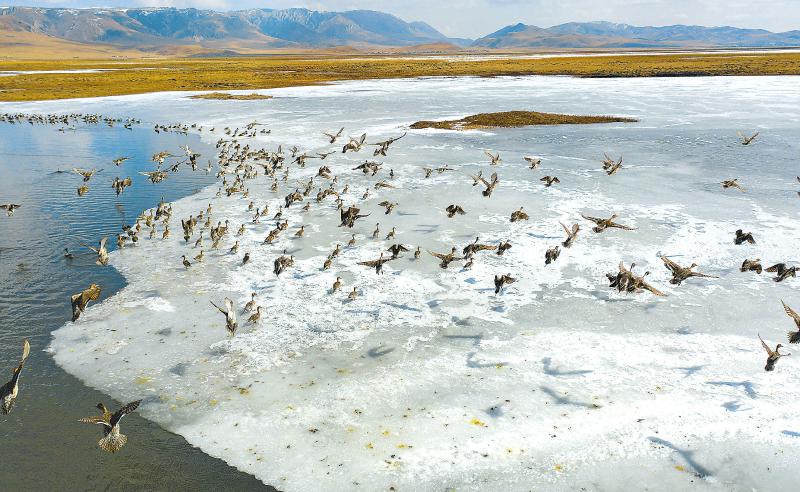 陽光下,數(shù)千只珍稀飛禽在光影交錯(cuò)的若爾蓋花湖嬉戲翱翔。尹鋼 攝(資料圖片)