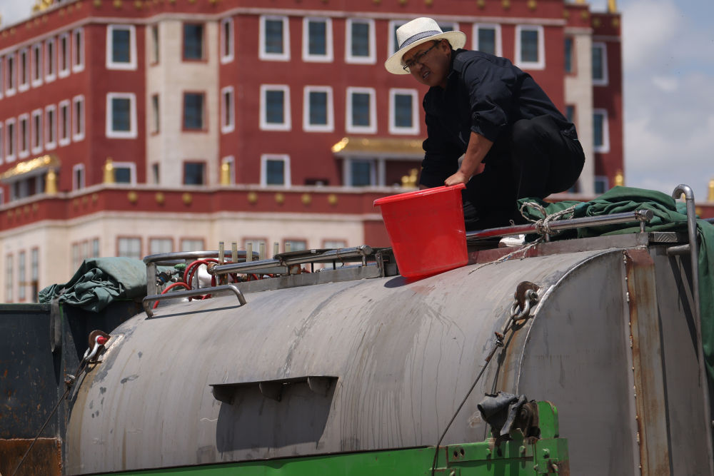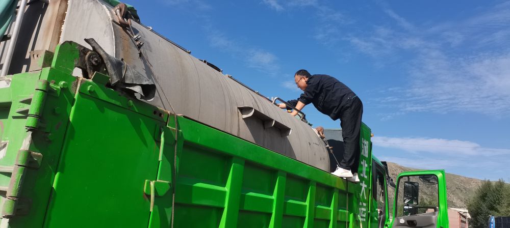 車(chē)輛進(jìn)入一處服務(wù)區(qū)后,緩緩?fù)?吭诼愤叀@铊硖萝?chē)去,爬上4米多高的車(chē)頂,打開(kāi)水箱蓋細(xì)細(xì)查看,有幾條小魚(yú)在水面上游動(dòng)著,似乎好奇地向外張望。