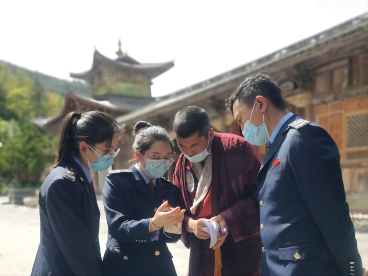 圖為縣稅務局“傈鄉(xiāng)稅宣小分隊”上門為壽國寺的藏傳佛教僧眾開展城鄉(xiāng)“兩險”手機繳納流程輔導和民族團結(jié)進步相關(guān)知識宣傳。
