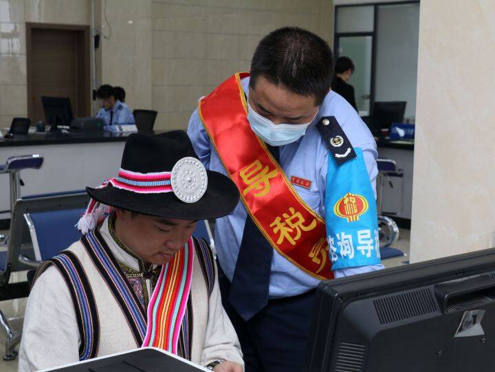 圖為在國家稅務總局維西傈僳族自治縣稅務局辦稅服務大廳,導稅員為前來辦理申報業(yè)務的傈僳族納稅人提供雙語業(yè)務輔導服務