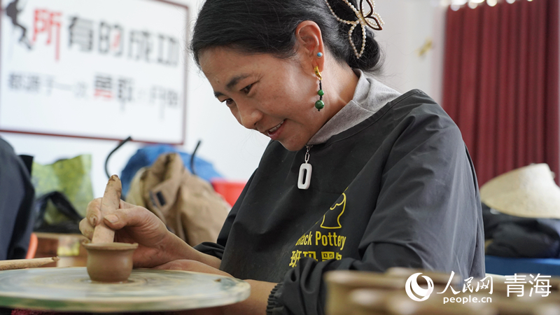 26歲的俄知喜歡黑陶,得知班瑪縣電子商務(wù)公共服務(wù)中心可以免費(fèi)學(xué)習(xí)的消息后,前來學(xué)習(xí)。人民網(wǎng)記者 楊啟紅攝