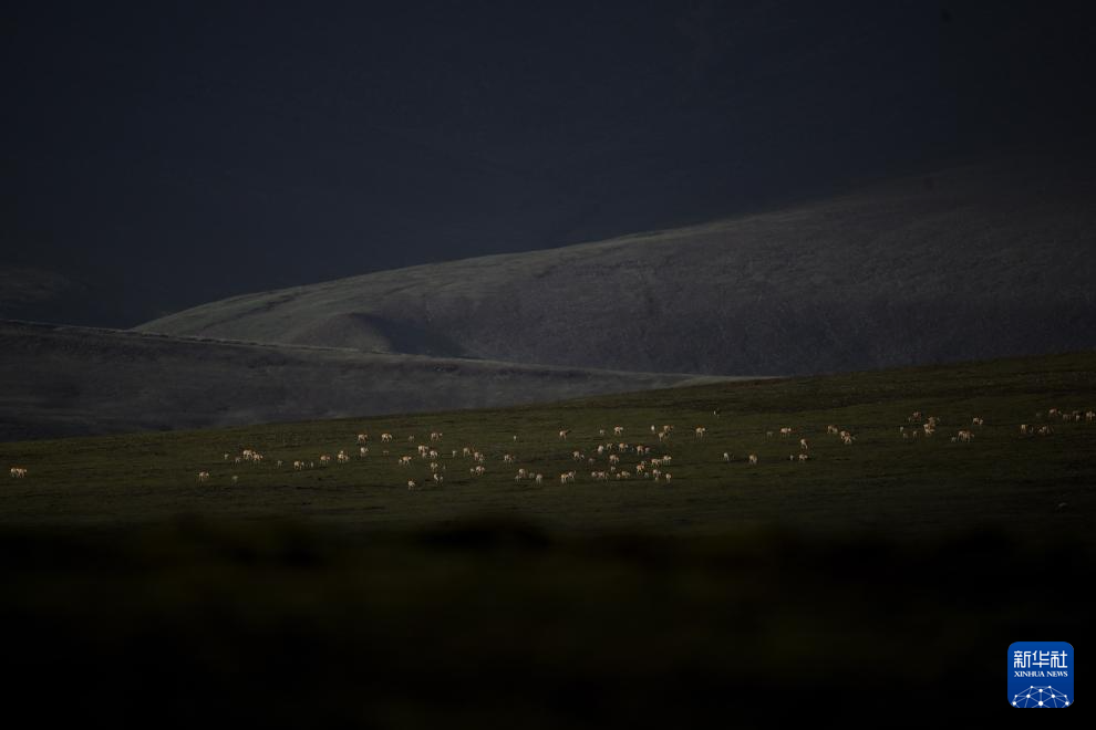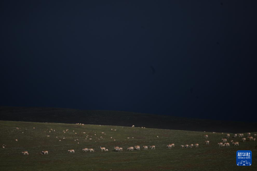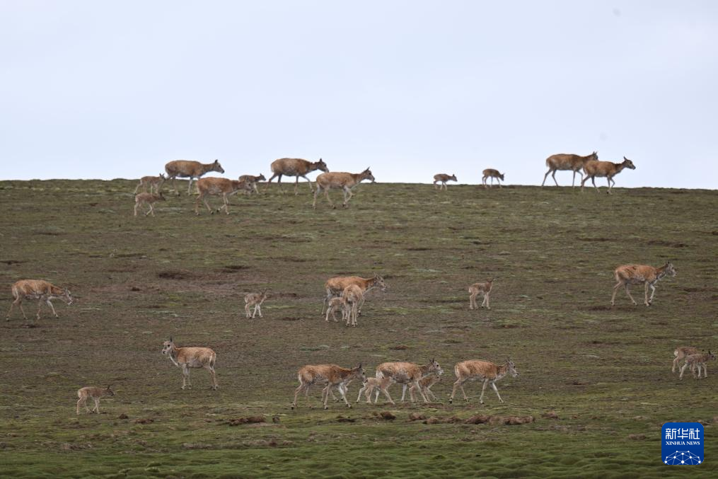 7月8日,在可可西里卓乃湖區(qū)域,一群藏羚羊在活動(dòng)。新華社記者 張龍 攝
